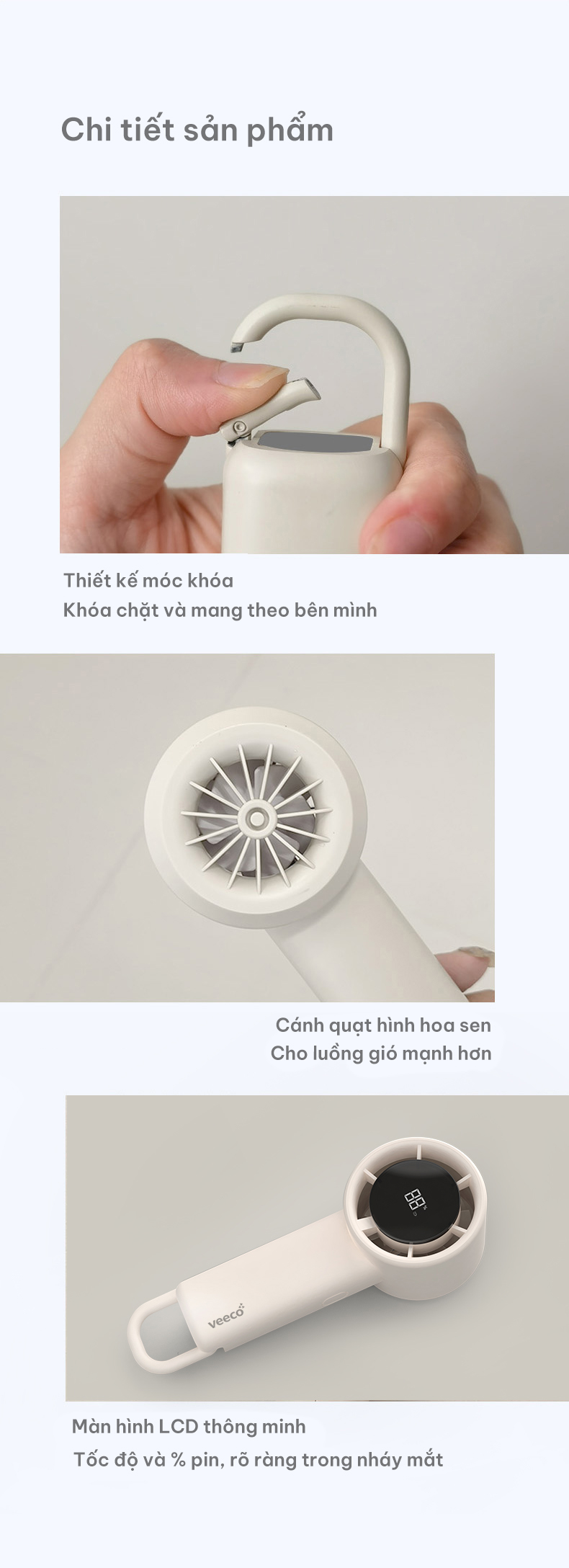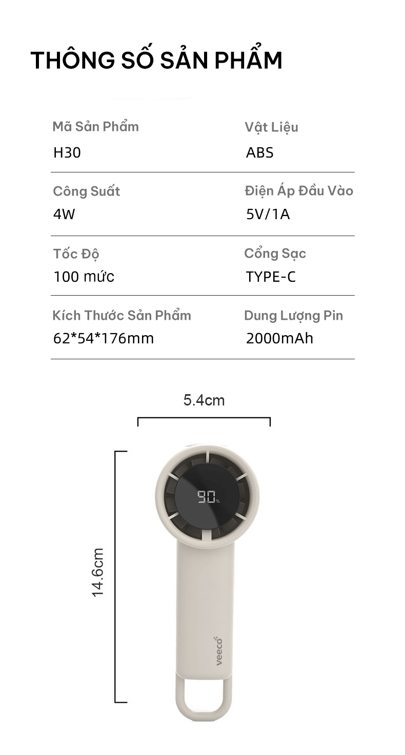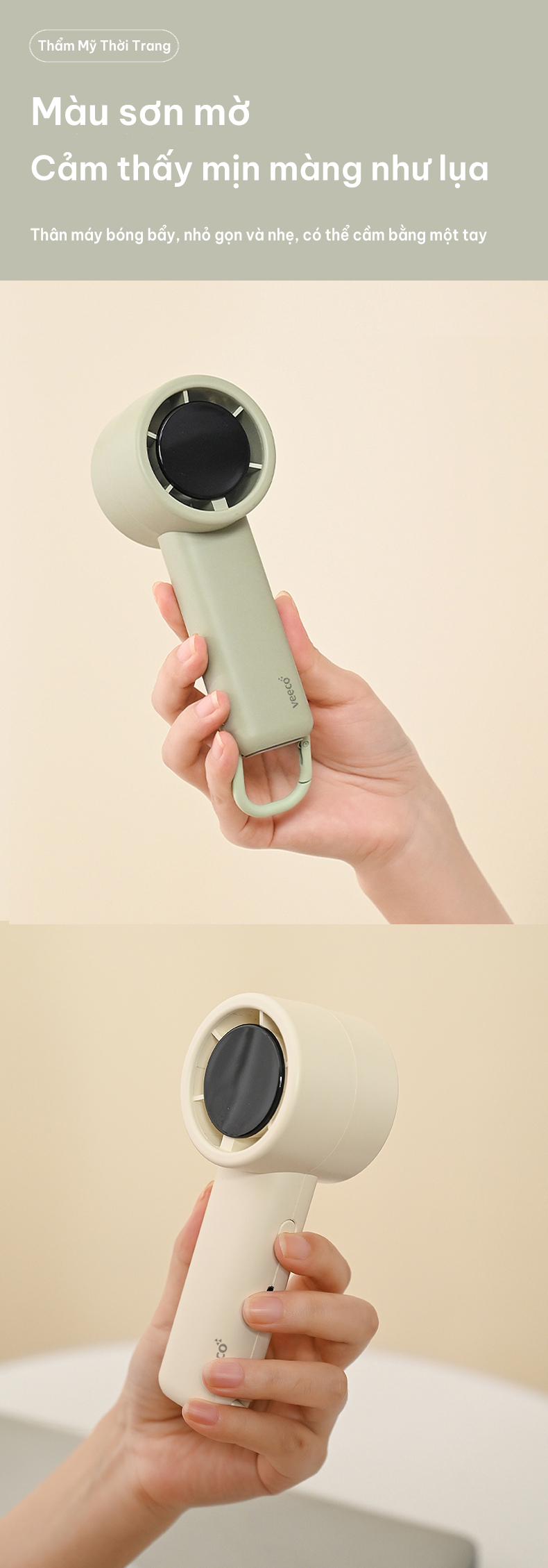 Quạt cầm tay VEECO VMF-30 là sự kết hợp hoàn hảo giữa tính năng làm mát mạnh mẽ và phong cách thời trang hiện đại. Với kích thước siêu gọn nhẹ chỉ 62 x 54 x 176mm và trọng lượng vỏn vẹn 165g, VMF-30 dễ dàng nằm gọn trong túi xách, balo hoặc cầm trên tay suốt cả ngày dài mà không gây mỏi. Đây là phụ kiện không thể thiếu cho những chuyến du lịch, đi làm, đi học hay tham gia các sự kiện ngoài trời.